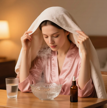 把精油滴入熱水充分攪勻后吸嗅熱蒸汽。